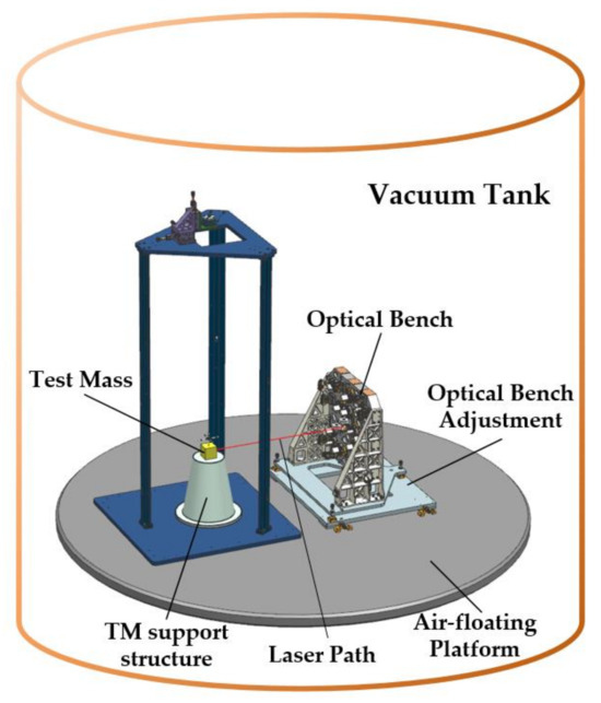 The vacuum test system at the HuaiRou Gravitational Wave Experimental Center, Institute of Mechanics, Chinese Academy of Sciences, served as the experimental facility for the interferometer resolution test. As shown in Figure 7 and Figure 8, the system consisted of three 3m-diameter interconnected tanks set on a base to isolate vibrations. For our experiment, we used only one of these tanks. The apparatus can produce a vacuum of 10−4 Pa. To isolate high-frequency ground vibration, an air-floating platform was placed inside the tank. The optical bench and its adjustment mechanism were mounted as a single unit on the vibration isolation platform, while the TM as a reflector was fixed on the same platform by means of its support structure. The laser was deflected through the prism to the TM and returned along the original path; this alignment process was realized by the optical bench’s adjustment mechanism. Finally, the laser and electrical signals were routed via the silo flange to the system.