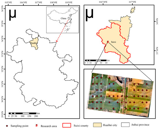 The study area is located in Suixi County, Huaibei City, Anhui Province, China, with geographic coordinates ranging from 116°24′ to 117°03′ E, 33°16′ to 34°10′ N, and an area of about 0.24 km2. The study area has a monsoon warm-temperate semi-humid climate, with mild rain in spring and fall, hot and rainy summer and cold and windy winter. The average annual temperature is 17 °C, the average wind speed is 2.2 m/s, the average precipitation is 737 mm, rainfall is mostly concentrated in June–August and the annual frost-free period is about 218 days.