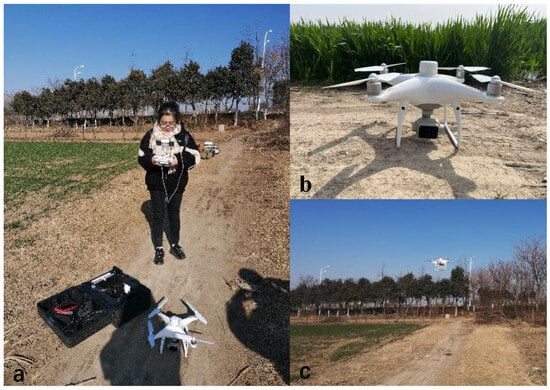 To avoid bad weather such as rain, snow and high winds, we chose to conduct aerial photography operations when the weather was clear and cloudless and the wind was light. We conducted a survey of the geographical conditions of the study area and the surrounding structures to ensure avoidance of interference from objects such as high-voltage power lines and tall trees during the drone flight. The collection of multispectral imagery by the drone took place on 10 January 2021, with a flight time between 11:00 a.m. and 2:00 p.m. Before takeoff, the drone was manually controlled to fly approximately 2.5 m directly above the calibration whiteboard. The camera was set to single-shot mode to capture images of the standard whiteboard. The whiteboard model used in this study was an SRT-99-100 with a diffuse reflectance of 99% and a size of 25.4 cm × 25.4 cm. The drone’s flight mode followed a pre-planned S-shaped flight path. The heading overlap was set to 75% and the side lap was set to 60%. The drone flew at a height of 100 m with the sensor lens facing vertically downward. The camera was set to capture images at equal time intervals, with a time interval of 3 s. Photographs of the operational site for UAV field data collection are shown in Figure 2.