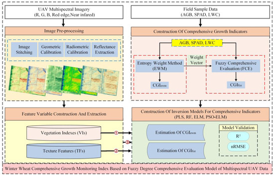 In this study, UAV remote sensing is utilized to obtain multispectral ortho imagery of the study area. The research focuses on the above-ground biomass (AGB), leaf chlorophyll content and leaf water content (LWC) of winter wheat. This study employs two methods, namely the entropy weight method (EWM) and the FCE model, to construct comprehensive growth indicators for winter wheat. The input variables include VIs, TFs and a combination of VIs and TFs. Four inversion models are developed, specifically random forest (RF); partial least squares (PLS); extreme learning machine (ELM); and particle swarm optimization extreme learning machine (PSO-ELM), to estimate the comprehensive growth indicators of winter wheat. Finally, the best inversion model is selected based on accuracy comparison in order to investigate the effectiveness of UAV multispectral imagery in monitoring the comprehensive growth indicator of winter wheat. This study provides valuable insights into the application of UAV remote sensing technology in monitoring and managing the growth of winter wheat.