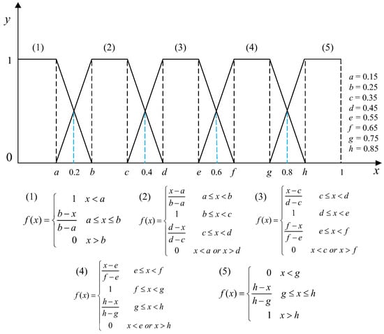 The membership function is utilized in fuzzy set theory to accurately represent and address real-world evaluation problems through the ranking and partitioning of fuzzy concepts. Considering the ambiguity in determining membership based on interval boundaries, this study utilized trapezoidal membership functions to construct the fuzzy degree matrix. The [0,1] was divided equally into 5 intervals corresponding to 5 rating levels. The fuzzy boundary gap between the head and tail was 0.15, and the center point gap was 0.1. The fuzzy boundary centers for adjacent rating levels were 0.2, 0.4, 0.6 and 0.8, respectively, as shown in Figure 4.