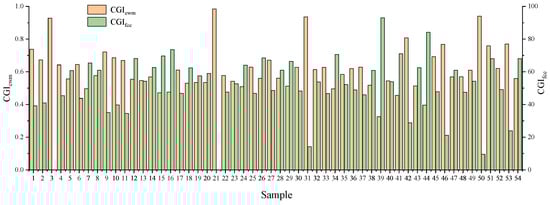 According to Equation (14), it can be observed that compared to leaf water content and chlorophyll content, the above-ground biomass had the highest contribution rate to the comprehensive growth indicator, with a weight of 0.624. The chlorophyll content followed next with a weight of 0.283, while leaf water content had the lowest contribution rate with a weight of 0.093. Figure 5 shows that most of the values of CGIewm were concentrated between 0.4 and 0.8, and most of the values of CGIfce were concentrated between 25 and 65. The figure illustrates that CGIewm and CGIfce exhibited opposite trends, suggesting that a smaller value of CGIfce indicates better winter wheat growth. The CGIfce values of Sample 3 and Sample 21 in the figure were zero and the values of CGIewm were high, indicating that the winter wheat in the sample quadrat was growing well.