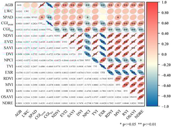 Correlation between growth indicators and vegetation indexes. Note: * indicates significant correlation at the 0.05 level; ** indicates significant correlation at the 0.01 level; red color indicates positive correlation and blue color indicates negative correlation; right tilted ellipse indicates positive correlation and left tilted ellipse indicates negative correlation; flatter ellipse indicates higher correlation and wider ellipse indicates lower correlation.