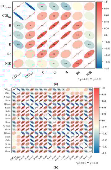 To address the issues of limited input features and the problem of spectral feature saturation, this study introduced TFs as additional input variable for the model. The final selection of VIs as input variables for the VI was based on their significant correlation at the 0.01 level with both CGIewm and CGIfce (CGIs). Performing correlation analysis between the composite indicators and individual bands (Figure 7a) revealed that both the G and R bands showed significant correlation at the 0.01 level with the two constructed composite indicators. Therefore, the texture information of the G and R bands was further analyzed for correlation with the composite indicators (Figure 7b). The TFs that exhibited significant correlation at the 0.01 level with both composite indicators were selected as the final texture feature selection results.