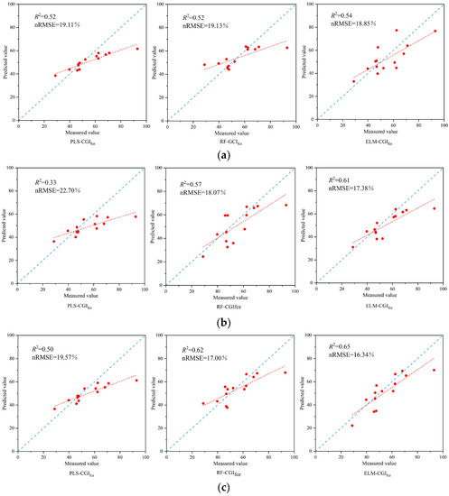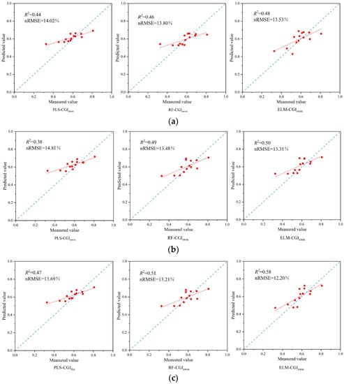 Figure 9a,b represents the model validation results of constructing CGIfce inversions with VIs and TFs input variables, respectively. As can be seen from the figures, ELM-CGIfce exhibited optimal model performance compared to both the PLS-CGIfce and RF-CGIfce models.