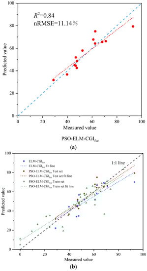 As can be seen from Figure 10b, compared with the scatterplot of the PSO-ELM-CGIfce model before optimization, most points were close to the 1:1 line after optimization of the algorithm, and the fitting line of the prediction point was closer to 1:1 line, indicating that after processing by the optimization algorithm, the difference between the predicted value and the measured value was reduced, and the PSO algorithm improved the prediction accuracy of the ELM-CGIfce model. At the same time, from the scatterplot dispersion degree and fitting line of the measured and predicted values of the training set, it can be seen that the accuracy of the scatterplot was relatively high and similar to that of the test set, indicating that the model has strong generalization ability.