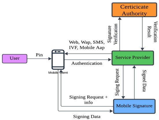 In recent times, novel methodologies for data encryption/decryption have emerged as solutions to counter various attacks. One solution to address these challenges is the utilization of mobile signatures, which facilitate the creation of qualified digital certificates for user authentication. These certifications are compliant with ETSI standards and are issued by authorised Certificate Authorities. ETSI is an abbreviation for the European Telecommunications Standards Institute. ETSI has only recently made available for public evaluation a draught standard that outlines a framework for verifying and standardising advanced electronic signatures (AdES) in mobile settings [40]. As an option to improve one’s level of privacy, EAL+-certified SIM cards are now accessible to the general public. A user’s subscription to the service triggers the activation of a certificate that is sent over the air. The secret key is safely maintained on the SIM card, while the public key is made accessible in a directory. Each certificate is made up of distinct public and private keys that are kept in different locations. When a user attempts to obtain access to a service, the service will first send a request to the user to provide authentication information as well as a signature [41]. A One-Time Password (OTP) or Personal Identification Number (PIN) is presented by the user’s device before gaining access to the signature. After that, the mobile operator sends this signature to the service provider, which then enables safe and authorised access to the service that the user desires. The signature is verified by the supplier of the service, who then gives access to the service that was requested. The process of using mobile signatures for user authentication is broken down into steps, which are shown in Figure 2.