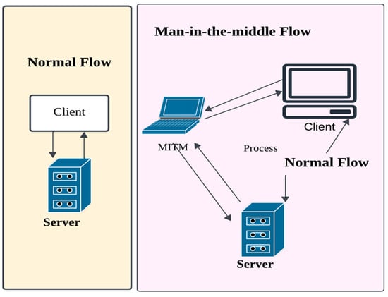 MITM attacks can allow the attackers to insert themselves between two communicating terminals without getting detected. These kinds of attacks consistently lack certain features, which makes them rare on the wired internet. There is the occurrence of contradictions in the situation for wireless connection. Depending on the nature of the protocol as a wireless link layer, the attacker can effortlessly insert user information. Figure 3 illustrates the difference between the flow of data in MITM and data in regular communication, or the normal flow of information. In general, the two parties can communicate with each other in normal flow, i.e., the server and client, without any mediation or intrusion of any MITM. While the communication is occurring between the man in the middle and the attacker in the MITM flow.