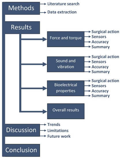 The structure of this systematic review is shown in Figure 1. The methods section describes how the literature search was performed, as well as the applied inclusion criteria and which data were extracted from the included studies. The results section covers the three categories of sensing. For each category, the surgical action that is performed in each study, the sensor type, the information processing method, the purpose and the accuracy of the sensing method is discussed and shortly summarised. The discussion section covers the development trends that emerge from the literature review, the limitations of this study and suggestions for future work. Finally, the conclusions section formulates an answer to the research questions of this systematic review.