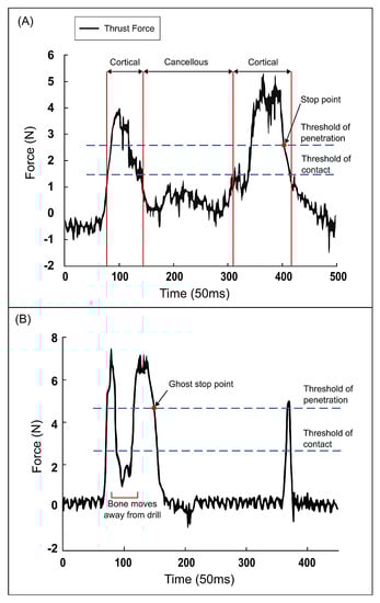 One study made use of the LC0505 piezoelectric quartz force sensor (Lance Technologies, Copley, OH, USA) to measure the thrust force in the robot milling of the lamina [31]. The data recorded by these sensors were often used to perform thresholding on the thrust force amplitude in order to differentiate between drilling in cancellous or cortical bone. Thresholding was applied in [18,21,22,23,24,25,26,27,28,31] where, for example, Tian et al. formulated a force threshold that corresponds with drilling into the second cortical layer. The drilling process was halted immediately when the threshold was reached. However, problems can occur when the sample moves due to, for example, breathing. The feed rate changes and thus the force will fluctuate more, leading to a force profile with two peaks during the drilling of the first cortical layer [23]. A control system will falsely identify that second peak as drilling in the second cortical layer and stop the procedure (see Figure 3). When the bone is temporarily moving along with the feed of the drill, the contact force can be much lower than in a situation with stationary tissue. As a consequence, the system does not recognise the penetration of a cortical layer of bone.