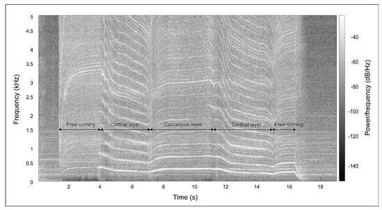 F, V, and S in Equation (1) represent the Fourier transforms of, respectively, the contact force between the drill bit and tissue, the velocity of the drill bit and its displacement. By creating a profile of the AI instead of the thrust force, the difference between drilling in cortical bone and cancellous bone becomes clearer and more consistent when the feed rate is not constant [26]. In [30], the force signal (after wavelet transformation to reduce noise) was used as input for a backpropagation artificial neural network (ANN) that can distinguish between milling in the outer cortical layer, the cancellous bone, the transitional layer between cancellous and cortical bone, and the inner cortical layer of the lamina. Furthermore, milling is performed by an ultrasonic bone scalpel that uses high-frequency vibrations to machine bone tissue with high impedance. Elastic soft tissue such as muscles or blood vessels is not cut by these vibrations and the bone surface after milling is smoother and flatter [30].