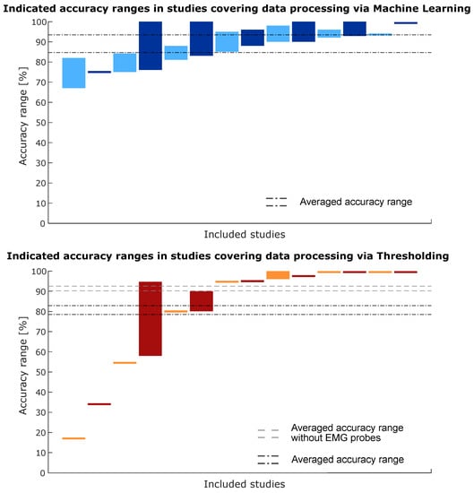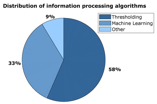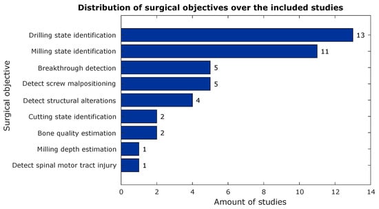 The studies using sound and vibration sensing contained five different surgical actions or procedures: drilling state identification, milling state identification, cutting state identification, breakthrough detection during bone drilling, and monitoring of bone and implant integrity (see Table 3). Eight studies from the research group of Dai et al. analysed the measurements during bone milling to recognise the tissue that is being milled [33,34,35,36,37,38,39,40]. Six studies did the same for drilling pilot holes for pedicle screw placement (PSP), drilling during laminectomy and during cervical discectomy [19,20,41,42,43,44,45]. In one study, measurements were performed during the cutting of large pieces of the vertebra such as the spinous process [46]. In two studies, acoustic emission signals (AE-signals) were analysed to determine the point during screw insertion at which the screw is overtightened and the thread in the bone is stripped or damaged [47,48]. Finally, there were also two other studies where specific pathologies in the (instrumented) vertebra were assessed by an analysis of the vibration and acoustic emissions [49,50].