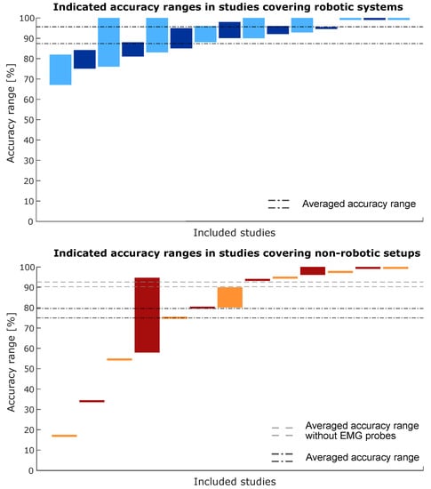 Six studies analysed the accuracy of the used sensing and classifying methods. Tian et al. analysed the pilot holes for pedicle screws: the drill did not penetrate the second cortical layer for all 32 holes, even for deliberately incorrectly planned trajectories [27]. The accuracy of the applied tissue recognition methods was assessed by [30] by means of force profiles that served as input for an ANN. This resulted in a recognition rate between 92.8% and 100%. Jin et al. assessed the accuracy by means of thresholding of the average drilling torque which resulted in two sets for the precision of state recognition: 67.29–74.29% and 71.87–81.88% [25]. The lower and upper values of each set corresponds to whether or not the system can differentiate between drilling in the outer and in the inner cortical layers (upper value corresponds with no differentiation). The difference between the first and the second set depends on whether, respectively, four states had to be recognised (free running of drill included) or three states (free running of drill not included). No data on the amount of test cases were available. Jiang et al. found that the success rate of detecting the correct halting point during was 60% (12/20 experiments) when no compensation for the movement of the bone was applied. When the robot compensated for sample motion, the success rate increased to 100% (20/20) [23].