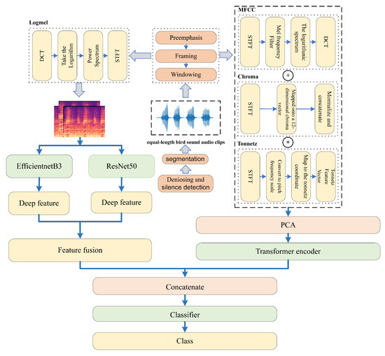 The process of the proposed method. The bird sounds were preprocessed, and the manually extracted log-mel spectrograms were then fed into two pretrained CNN-based networks to acquire a set of deep features. Three more manually extracted features (MFCC, Chroma, and Tonnetz features) were combined, forming a feature set that was subsequently encoded by an improved transformer encoder. Finally, both resulting deep feature vectors were fused and passed to a classifier for classification.