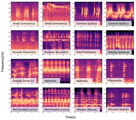 A log-mel spectrogram of bird sounds provides a visual representation of how the frequency components of bird sounds change over time using a logarithmic scale [7]. First, we applied the short-time Fourier transform (STFT) [43] to the bird sound fragments to obtain a spectrogram. Subsequently, we used a filter bank with 128 frequency bands to map the spectrogram to the mel scale because it aligns better with the human auditory system’s perception and is more suitable for bird sound feature extraction [44]. Then, we performed a logarithmic transformation to obtain the log-mel spectrogram. The log-mel spectrogram holds significant biological relevance and interpretability and possesses extensive applications in various fields, including sound recognition and audio classification [45]. The log-mel spectrograms of selected bird sound clips are shown in Figure 3.