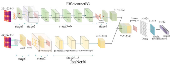 As illustrated in Figure 4, the manually extracted log-mel spectrograms were used as inputs for the pretrained EfficientNetB3 [37] and ResNet50 [38] networks. The outputs of each network were then fused to obtain a set of deep feature vectors. We retained the feature extraction layer of the EfficientNetB3 model while discarding its top network. The features extracted by both CNN-based networks were fused, and an average pooling layer was applied to compute the average of each channel in the matrix, resulting in a feature vector with a size of (7, 7, 3340). To reduce the dimensionality of the fused deep feature vector, a dense layer was added, followed by a normalization layer. The normalization layer served multiple purposes, including accelerating the network training and convergence processes, controlling gradient explosion, and preventing gradient vanishing [53]. Finally, a set of deep feature vectors with a size of (1, 512) was obtained.