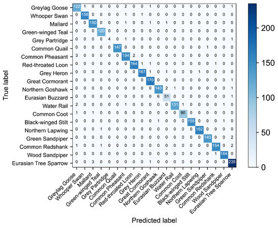 The Birdsdata dataset, curated and collected through a collaboration between the Beijing Zhiyuan Institute of Artificial Intelligence and Hundred Birds Data, is highly regarded for its credibility and precision [26,30]. The dataset comprises recordings of 20 prevalent bird species. All bird sound clips underwent rigorous noise reduction and were trimmed to uniform lengths. Consequently, no further data preprocessing was applied. With 14,311 bird sound clips each lasting 2 s, approximately 90% of the species possessed over 300 samples, while approximately 5% of the species included less than 50 samples, ensuring comprehensive representations; https://data.baai.ac.cn/details/Birdsdata, accessed on 28 June 2023.