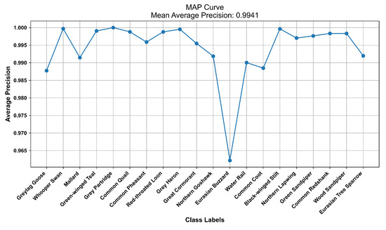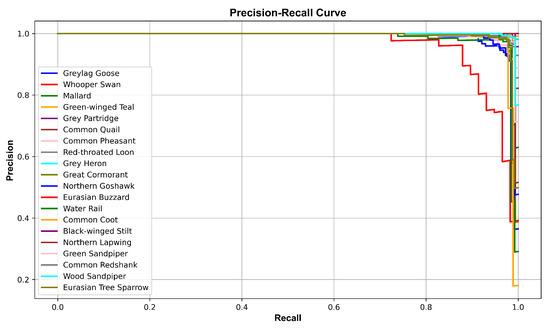 During the testing phase, the predicted and actual labels of each sample were recorded. A multiclass confusion matrix was generated using Birdsdata as an example, as presented in Figure 7. This confusion matrix enabled the calculation of accuracy, recall, and F1 score values for each bird species, as outlined in Table 4. Notably, the recall and F1 scores obtained for the gray partridge and Eurasian buzzard were considerably lower than those produced for the other birds. Specifically, the recall rate achieved for the gray partridge was 66.7%, accompanied by an F1 score of 80.0%. In contrast, the Eurasian buzzard demonstrated a recall rate of 87.9% and an F1 score of 90.3%, as depicted in Table 4. This could be attributed to the relatively small numbers of training samples available for these two birds compared to the other species, as well as their less distinctive bird sound features, resulting in lower overall scores. Figure 8 displays the average precision curve obtained on the Birdsdata dataset, featuring an MAP of 0.994. Furthermore, Figure 9 illustrates the precision–recall curve for the same dataset, effectively providing a visual representation of the model’s remarkable bird sound recognition ability.
