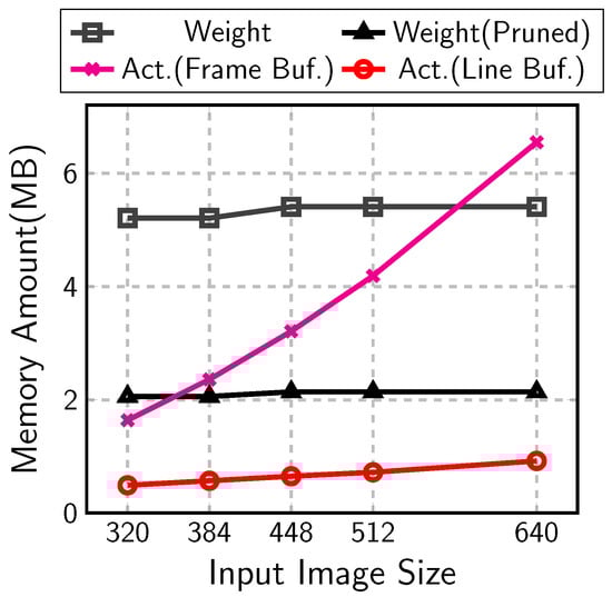 The memory sizes are analyzed in Figure 1 for the object-detection CNNs consisting of MobileNetV1 [2] and SSDLiteX [34], a variant of SSDLite. The CNNs are built for images with various sizes from 320 to 640. The number of auxiliary layer stages changes with the input sizes: four stages for the input sizes 320 and 384 and five stages for 448 to 640. The figure compares the memory amounts for each type of data with 8-bit quantization. For small input images, the memory amount for the activation frame buffer is around one third of that for the weights, which were denoted as Act.(Frame Buf.) and Weight in the figure, respectively. With large input images, however, the activations occupy almost the same memory as the weights do. Furthermore, the weight amount can be reduced by pruning.