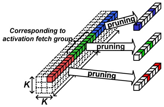 The algorithm part of the proposed AoCStream exploits the accelerator-aware pruning, which prunes weights with a regular pattern proper to an accelerator architecture [32]. As shown in Figure 3, the weights are pruned so that an equal number of weights remains for every activation group fetched together. With the accelerator-aware pruning, no additional processing cycles are required, and multipliers can be fully utilized, as shown in Figure 4. Even with the regular pattern, the pruning scheme can prune as much as the unstructured pruning without degrading the accelerator efficiency [32].