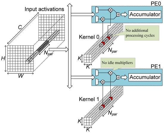 Figure 2 illustrates a convolutional layer processing in a sparsity architecture like Cambricon-X [35] when the layer is pruned by unstructured pruning. In the accelerator structure of the figure, a group of input activations is fetched and broadcasted to processing elements (PEs). In the part of a kernel corresponding to the fetched activations, some weights are pruned to be zero (grey in the figure) and some weights are remained to be non-zero (red in the figure). Each PE has two multipliers and reads two non-zero weights from the weight memory. The PE selects activations corresponding to the non-zero weights and multiplies the weights and activations to sum and accumulate the results. In the unstructured pruning, there is no pattern, so in some kernels, three non-zero weights can be remained for the fetched group of activations, as shown in the upper kernel. Then one more cycle is required to process the third non-zero weight. In some kernels, only one non-zero weight can remain for the feature group of activations, as shown in the lower kernel, and then a multiplier in PE1 is in an idle state, doing nothing. Furthermore, for the additional cycle for the process of the third non-zero weight in the upper kernel, both multipliers in PE1 are in an idle state, too. The unstructured pruning leads to additional processing cycles and low multiplier utilization.