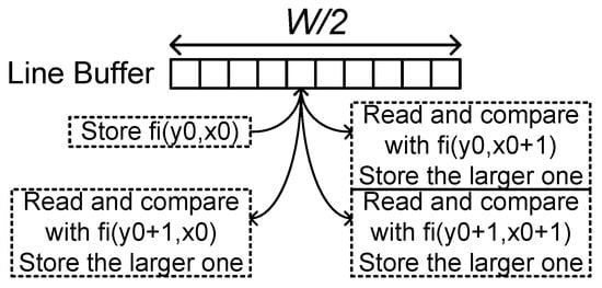 The pooling layer block can be implemented in a similar way to the structure of the depthwise convolutional layer block. The maximum or average operators are used in the processing elements instead of multipliers and accumulators. The structure requires the line buffer of lines and an output buffer for the data rate adjustment. However, for some configurations, the line-buffer size can be reduced. Figure 8 shows the max pooling layer operation when K = 2 and S = 2. When the block receives activations for even and , the block stores the activations. With the activations on the next position, , the block reads the stored activations and compares them with the input data. The larger values are stored at the same line-buffer location. On the next row, the read-compare-write operation is repeated for and on the same line-buffer location. Then the maximum value is stored in the line buffer. This operation flow only requires a line buffer of a half line.