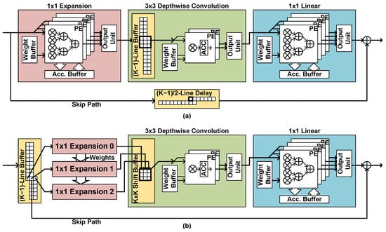 To implement a bottleneck residual block, two line buffers are required, in the depthwise convolutional layer and the skip path, as shown in Figure 9a. If the input size of the residual block is , the sizes of the line buffers are and , respectively. The line buffers in the depthwise convolutional layer may occupy a major part of the activation memory because their sizes are t-times larger than the other line buffers.