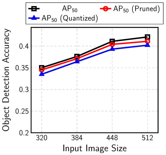 Object-detection CNNs based on MobileNetV1/V2 and SSDLiteX with various input sizes were trained and implemented with the proposed AoCStream architecture. The CNNs were trained with the MS COCO data set and pruned by the accelerator-aware pruning. The pruning ratio is 62.5% or 75%, which means five or six weights are pruned for every eight weights along the channel axis. The pruned CNNs were quantized with 8–10 bits without fine-tuning. The object-detection accuracy, , for the MS COCO dataset is provided after each step of training, pruning, and quantization in Figure 12. Pruning and quantization degrade by around 0.01–0.02, but the detection accuracy is still high for such compact CNNs. If retraining is applied with quantization, better detection accuracy could be obtained. The final values are shown in the fifth row of Table 2.
