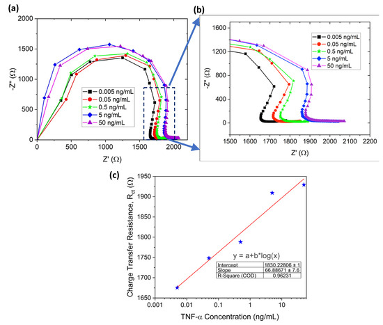 - Kongsuphol, P.; Ng, H.H.; Pursey, J.P.; Arya, S.K.; Wong, C.C.; Stulz, E.; Park, M.K. EIS-based biosensor for ultra-sensitive detection of TNF-α from non-diluted human serum. Biosens. Bioelectron. 2014, 61, 274–279. [Google Scholar] [CrossRef] [PubMed]