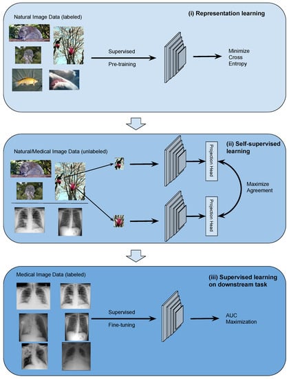 Overview of the proposed deep learning framework: (i) conduct general representation learning on large-scale natural image data sets using supervised learning, (ii) conduct refined representation learning using natural/medical image data sets with self-supervised learning, and (iii) conduct fine-tuning on downstream data set with supervised learning through AUC maximization.