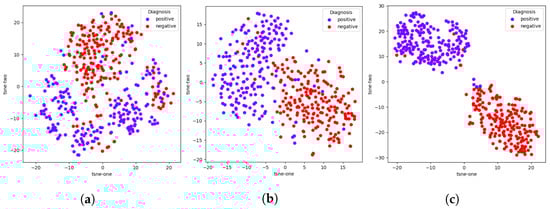 We perform an extension of the previous ablation study with each module of the TRUDLMIA framework by computing feature embeddings for the 400 testing images in the COVIDx dataset. We then apply the t-SNE [] to their embeddings, which are model outputs immediately before fully connected layers, as these outputs hold the most semantic information about the original images as well as the classes they belong to. These t-SNE results using a 2D mapping are plotted in Figure 2.