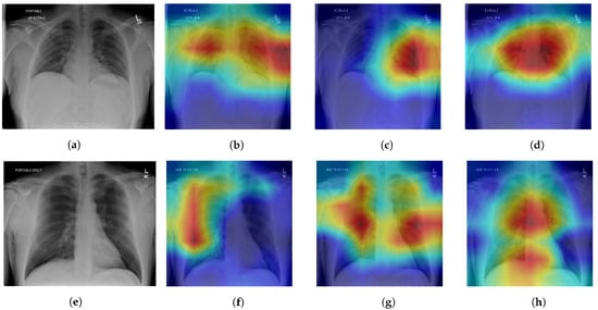 We chose two positive data samples from the test dataset. The first patient’s X-ray (Figure 3a) shows increased interstitial markings at the base of the right lung, denoting a possible early infectious process. The second patient’s X-ray (Figure 3e) shows increased interstitial markings throughout both lungs with some airspace opacities present in the left lower lobe. It should be noted that these are not radiologist interpretations or a full radiological report of the X-rays, but only an interpretation of the lung space area performed by a clinician (one of the co-authors) performed during a clinical care episode.