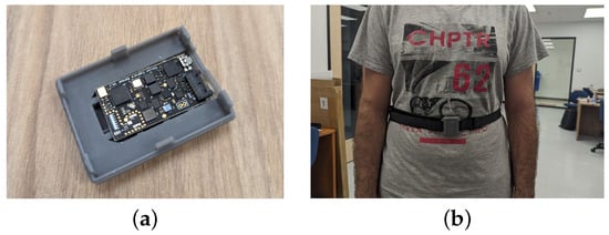 Different views of the ibNav 6.1 sensor. (a) The board itself. (b) The sensor on the user’s chest.