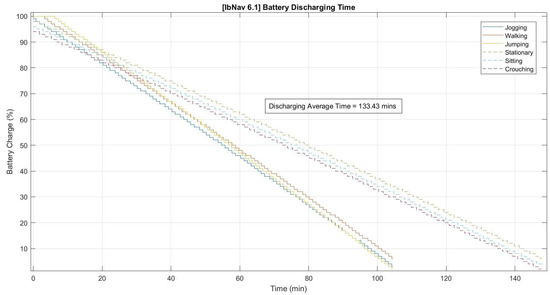 In the assessment of the battery performance for ibNav 6.1, several crucial insights were gleaned from its 500mAh battery capacity. As depicted in Figure 3, the charging metrics of the device stood out as particularly noteworthy. The observed charging duration demonstrated both consistency and efficiency, suggesting that the ibNav 6.1 is adeptly designed for minimal downtime, thus enhancing its readiness for swift redeployment after depletion. Shifting the focus to the battery’s discharging behavior, Figure 4 provides a detailed account across six varied tests. These discharge trends furnish a comprehensive understanding of the device’s power consumption across an array of operational scenarios. Notably, the consistency in discharge rates across these tests emphasizes the device’s stability and reliability. This steadiness is particularly valuable when anticipating the device’s performance in prolonged real-time applications. At the same time, any deviations or anomalies in the discharge patterns could be instrumental in identifying specific operational conditions or tasks that may strain the battery, paving the way for potential optimizations in future iterations.
