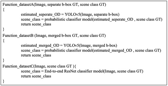 A comparative analysis of three algorithms is conducted using the matched datasets. The first two approaches use object detection techniques to determine the scene class. They utilize a probabilistic classifier to provide information on both the object-bounding box class and the scene class for each image. In contrast, the third approach is an end-to-end scene classifier that solely focuses on scene classification and does not rely on a bounding-box dataset. All datasets used in this study have consistent and seamless scene class data for the same image frames. While the evaluation of detection algorithms is confined to dataset A and B, the classification algorithm evaluation includes all three datasets. Overall, this study aimed to compare the effectiveness of the three algorithms in scene classification.