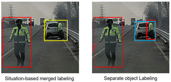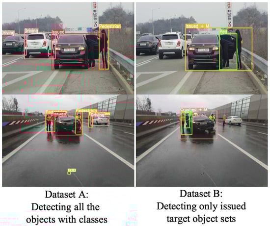 In Table 1 and Figure 4, the definitions of two bounding box concepts, namely separate class (dataset A) and merged concept (dataset B), are presented. The separate class encompasses issued vehicles, driving vehicles, emergency vehicles, pedestrians, and foreign object debris (FODs). The primary focus of the separate class is to capture the bounding boxes of all traffic objects, which can serve as indicators for classifying special events. Conversely, the merged concept (dataset B) emphasizes a more comprehensive understanding of direct traffic events by providing object bounding boxes as a scene issue class. This class includes issued vehicles, issued vehicles with pedestrians, pedestrians only, congested vehicles, and road debris. It offers a more comprehensive definition of the class. In both datasets, the term “issued vehicles” refers to vehicles that have come to a halt due to an accident or malfunction.