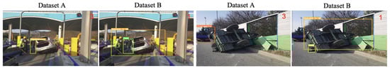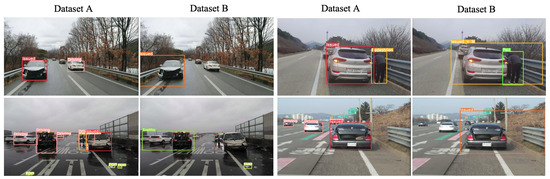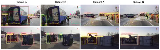 For the object detection algorithms, Figure 5 depicts the two object detection results within the different datasets. Within dataset A, it detects all the nearby objects whether they are among properly driving cars, issued vehicles, emergency vehicles, pedestrians, or foreign objects. For dataset B, the issued target scene objects are only labeled as ground truth. The focus is on whether they are in trouble like issued vehicles, pedestrians, or foreign objects. If no issues with proper traffic players are detected, such as for normal driving vehicles, then it is not considered an object target in this dataset.