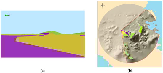 The visual landscape can be approached/modeled either from the human (ground) standpoint, i.e., the way people experience their surroundings in everyday life (as they stand, walk, etc.), or from a standpoint whereby land is vertically projected from above, i.e., the way maps portray parts of the landscape (in cartographic products and geovisualizations). The first perspective is defined as egocentric while the second one as exocentric (e.g., [21,23,79,80,81]). Figure 2 provides an illustration depicting how the same (abstracted) visual landscape can be conceived and rendered under two meaningful, alternative perspectives/visualizations; Figure 2a portrays the egocentric perspective, whereas Figure 2b portrays the exocentric perspective (for more details, see [21,23]).