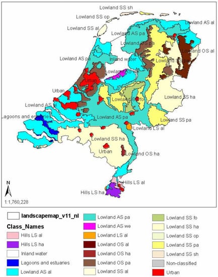 Examples of large landscape/geographic units included in the LANMAP classification methodology: the landscape types (e.g., Hills LS al, Lowland OS ha, etc.) that are cartographically represented occur due to the combination (overlaying) of suitable input geospatial data (e.g., altitude, land use, etc.). Figure adopted from [95].