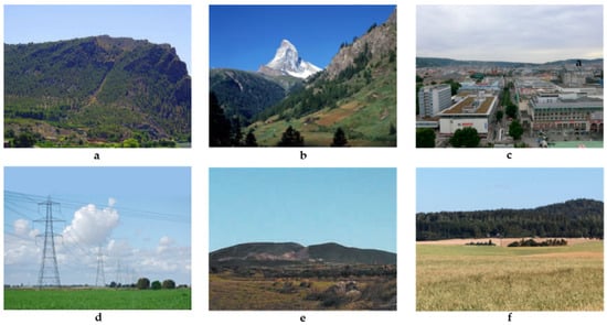 The range of ‘eligible’ landscapes or landscape types considered in this article is also wide: from the large geographic units that are cartographically represented in maps created by landscape classification methodologies, such as LANMAP(2) [89,91] (Figure 4), up to the visual scenes occurring in the everyday life, characterized as ‘urban’, ‘rural’, ‘forest, ‘mountainous’, ‘industrial’, ‘mining’ landscapes, etc. (e.g., [26,29,44,55,129,130]) (Figure 4). Figure 4 and Figure 5 provide indicative landscape (type) examples at the two ‘ends of the spectrum’ of landscape conception, respectively.