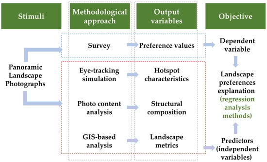 A very promising article that intertwines landscape perception with landscape evaluation from both perspectives is authored by Schirpke et al. [100] which developed a pioneering methodology to compare the information type obtained through eye-tracking simulation with landscape preferences. More specifically, they compared information in the following ways: (1) Based on a large number of (egocentrically-captured) landscape photographs, representing major Alpine landscape types, using visual perception eye tracking hotspot-based indicators (i) and variables describing the content of the landscape photographs (ii); (2) Based on (exocentric-based) landscape metrics derived using the visible (viewshed-delineated) landscape’s spatial patterns (based on the research of [20]). Figure 6 schematically summarizes the methodology being developed and implemented in [100]. Although the analysis of eye-tracking hotspots is limited in generic explanations across different landscape types, it is a great step forward.