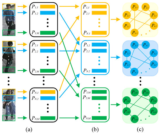 Similarity Graph. To enhance the flexibility of deep model, we design the similarity graph to describe the relationship of local features among different pedestrian images. The similarity graph treats the local features as the nodes, and takes the similarity between nodes as the edge weight. Specifically, for the local features from the m-th parts in pedestrian images, their relationship is described by the adjacency matrix , and represents the edge weight between the m-th parts in the i-th and the j-th pedestrian images. It is defined as: