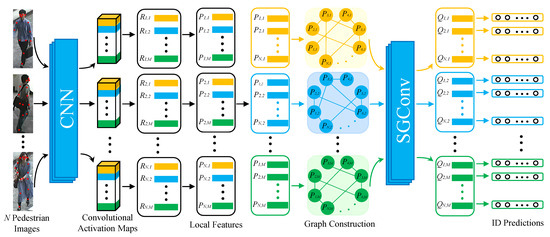 where ∈ consists of local features from the m-th parts in pedestrian images, ∈ and ∈ are the parameter matrices, and is implemented by the function. For the first SGConv layer, .
