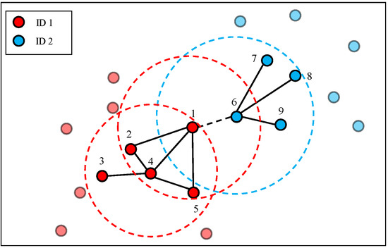 For ease of understanding, as depicted in Figure 4, we give an example of edge weight calculation. If we assume , then (node 1, 4) = {node 2, node 4, node 5, node 6}, (node 4, 4) = {node 1, node 2, node 3, node 5}, and (node 6, 4) = {node 1, node 7, node 8, node 9}. Consequently, (node 1, 4) ∩(node 4, 4)| = |{node 2, node 5}| = 2, that is, the edge weight between node 1 and node 4 is 2. |(node 1, 4) ∩(node 6, 4)| = |Ø| = 0, that is, the edge weight between node 1 and node 6 is 0. Here, we find an interesting phenomenon. Nodes with the same ID (node 1 and node 4) have larger edge weight than nodes with different IDs (node 1 and node 6), even though node 6 is closer to node 1 than node 4. It is clear that the overlap graph is robust to environmental variations because the contexts of nodes are considered.