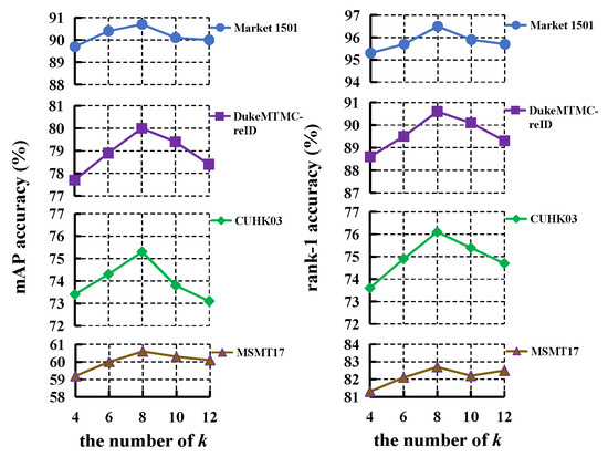 Firstly, we evaluate the effect of k in Equation (1), which is related to the adjacency matrix of overlap graph, and the results are presented in Figure 7. The mAP and rank-1 improves all the four databases when k increases from 4 to 8, while both of them decline when . Therefore, we choose in the experiments.