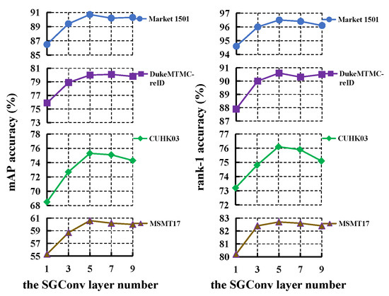 We perform ablation experiments on four databases so as to investigate the contribution of each component in LRGCN. As shown in Table 1, CNN denotes that we only utilize the CNN model of LRGCN to learn feature representations, and CNN + re-ranking denotes that we use re-ranking technology for CNN. CNN + S employ the similarity graph to model the relationship of local features among different pedestrian images, and CNN + sharing adopts the same transformation function to process and , i.e., = in Equation (6). CNN + O employ the overlap graph to model the relationship of local features among different pedestrian images, CNN + single adopts the single local feature to replace the concatenated local feature when selecting the k nearest neighborhoods for the overlap graph, and CNN + updating indicates that we update the overlap graph in each graph convolutional layer. CNN + O + S denotes that SGConv is replaced by the traditional graph convolution operation, and LRGCN_concatenating denotes that we apply GCN to the concatenated local features.