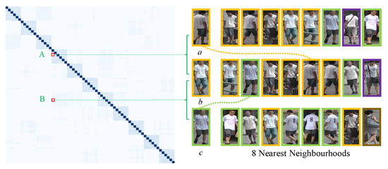 Figure 9 shows an example of the adjacency matrix of overlap graph. In the left color matrix, each color block corresponds to an element in the adjacency matrix, and the deeper color represents the larger value. For each image, we list its 8 nearest neighborhoods and use the same color bounding boxes to mark the pedestrian images with the same identity.