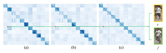 Visualization of the adjacency matrix of the similarity graph. The (a–c) correspond to the adjacency matrices of similarity graphs in the 1st, 3rd, and 5th SGConv layers, respectively. The e and f denote pedestrian images with different IDs, respectively.