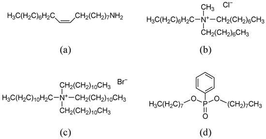 Structure of membrane components: (a) OAm; (b) TOMACl; (c) TDAB; and (d) DOPP.