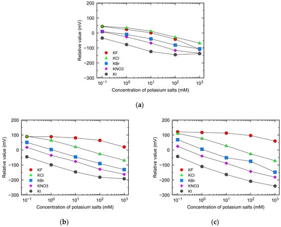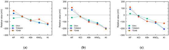 Figure 6 shows the relative values recorded by sensors with membranes containing lipids (OAm, TOMACl, TDAB) at concentrations of 1 mM, 10 mM, and 100 mM in 100 mM potassium salt (KF, KCl, KBr, KNO3, KI)-containing aqueous solutions. An increase in lipid content resulted in a negative shift in the relative values for Cl−, Br−, NO3−, and I− ions in all the sensors using different lipids. This can be attributed to an increase in the positive charge at the sensor membrane interface, which corresponds to an increase in the anion binding sites, leading to an improved sensitivity to these anions. However, the negative shift in relative values between sensors with 10 mM and 100 mM lipid content was marginal, due to the saturation of the potential response caused by the strong positive charge of the membrane [13,19,20]. When measuring I− ions using the TDAB sensor, a distinctive trend was indicated where the relative values shifted in the positive direction as the lipid content increased from 10 mM to 100 mM (Figure 5b,c). This unexpected trend matches the characteristics of previously studied negatively charged lipid polymer membrane sensors composed of high concentration of TFPB [8]. Insufficiently fixed TDAB molecules at the membrane interface are considered to contribute to this phenomenon. On the other hand, with an increase in the lipid content, the relative values for F− ions shifted in the positive direction. This can be attributed to the fact that when the sensor has a higher lipid content and a stronger positive charge at the membrane interface, it is less shielded by F− ions that are strongly hydrated. For instance, the differences in relative values for each anion species were made clear when the lipid content was increased. These results indicate that increasing the lipid content is effective in improving anion selectivity.